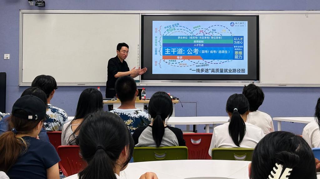 结合太阳成集团tyc122ccvip各专业特点与当前就业趋势,祝老师深入剖析了未来的就业前景,强调了尽早树立就业目标、科学进行职业规划的重要性。他通过“一线多途”高质量就业路径图,细致讲解了各类公招考试不同方向的选择策略与准备要点。依托其在公考培训领域的多年积淀,祝老师分享了诸多独到见解,并指出,无论是选择哪条路径,思维能力的持续锻炼与提升都是实现高质量就业的核心竞争力。
