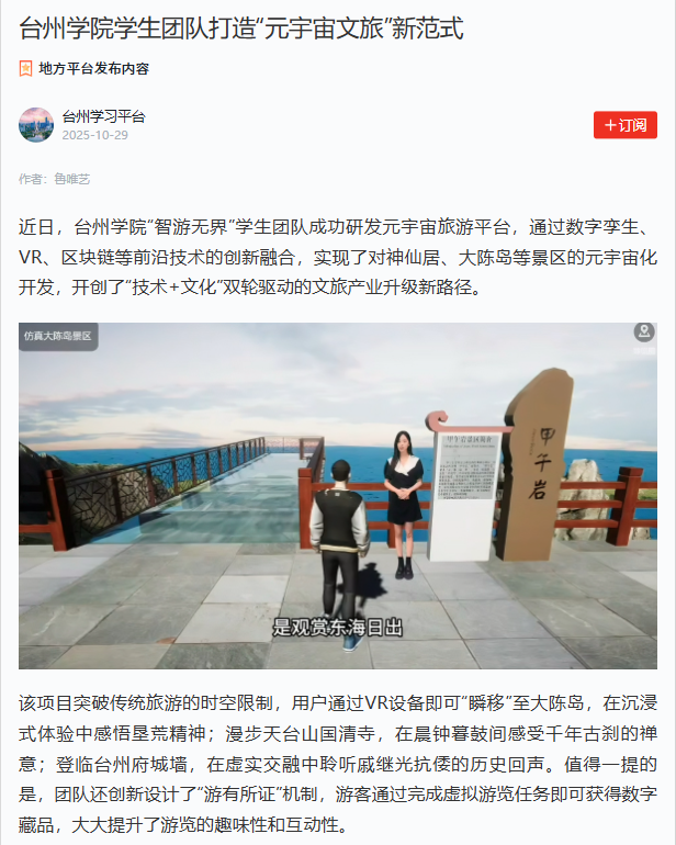 近日,122cc太阳成集团“智游无界”学生团队成功研发元宇宙旅游平台,通过数字孪生、VR、区块链等前沿技术的创新融合,实现了对神仙居、大陈岛等景区的元宇宙化开发,开创了“技术+文化”双轮驱动的文旅产业升级新路径。