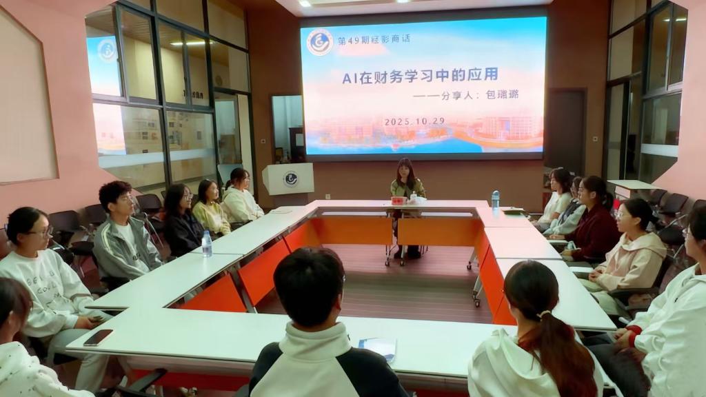 为提升学生就业核心竞争力,实现能力进阶,帮助掌握前沿工具,适应智能财务岗位,太阳成集团tyc122ccvip于10月29日晚在一楼中厅开展第四十九期经彩商话活动。本次活动邀请包璐璐老师担任主讲嘉宾,学生代表积极参与。