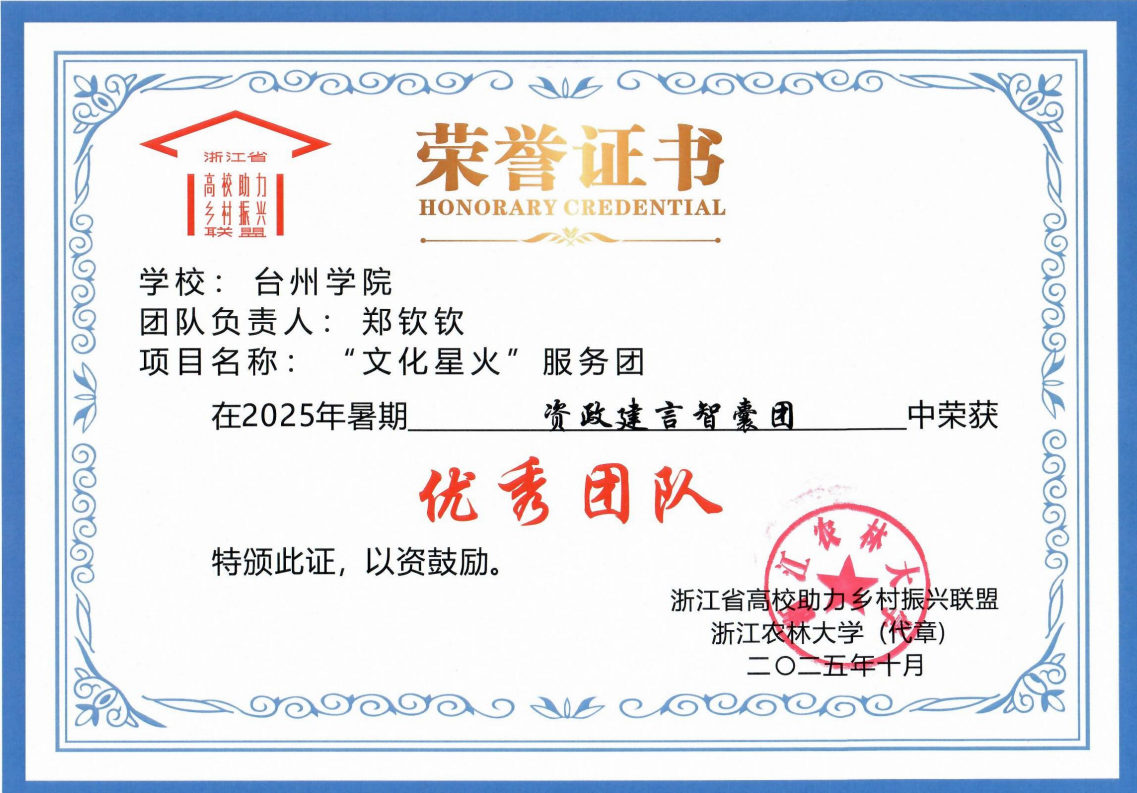 近日,从浙江省高校助力乡村振兴联盟传来喜讯,太阳成集团tyc122ccvip“文化星火”服务团在2025年度评选中脱颖而出,荣获“浙江省高校暑期服务乡村振兴工作优秀团队”称号。这一荣誉是对太阳成集团tyc122ccvip积极服务地方发展、深入践行乡村振兴战略的充分肯定。