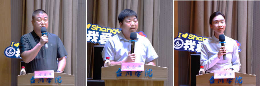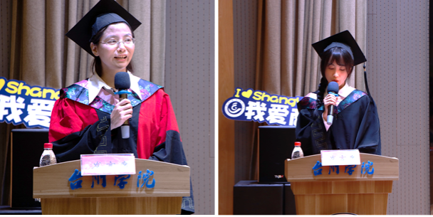 2003届旅游管理专业毕业生李强和2008届经济管理专业杨杭阳代表校友发言,他们回忆往昔,向即将毕业的学弟学妹们分享个人感悟。李强鼓励毕业生们做一个自信、大方、积极的人,学会选择、感恩、总结。杨杭阳提出三点建议与同学们共勉:树立目标,脚踏实地;拥抱变化,守正创新;终身学习,常怀感恩。泰隆银行台州分行人力资源部负责人潘素贞作为用人单位代表发言,她提醒大家职场没有捷径,每一份成绩的获得都需要永不言弃、坚守初心;持续学习、保持思考;把握当下、全力以赴。